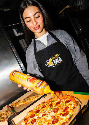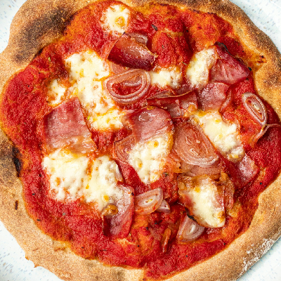 Sauce tomate, mozzarella, viande hachée, poulet mariné, oignons rouges